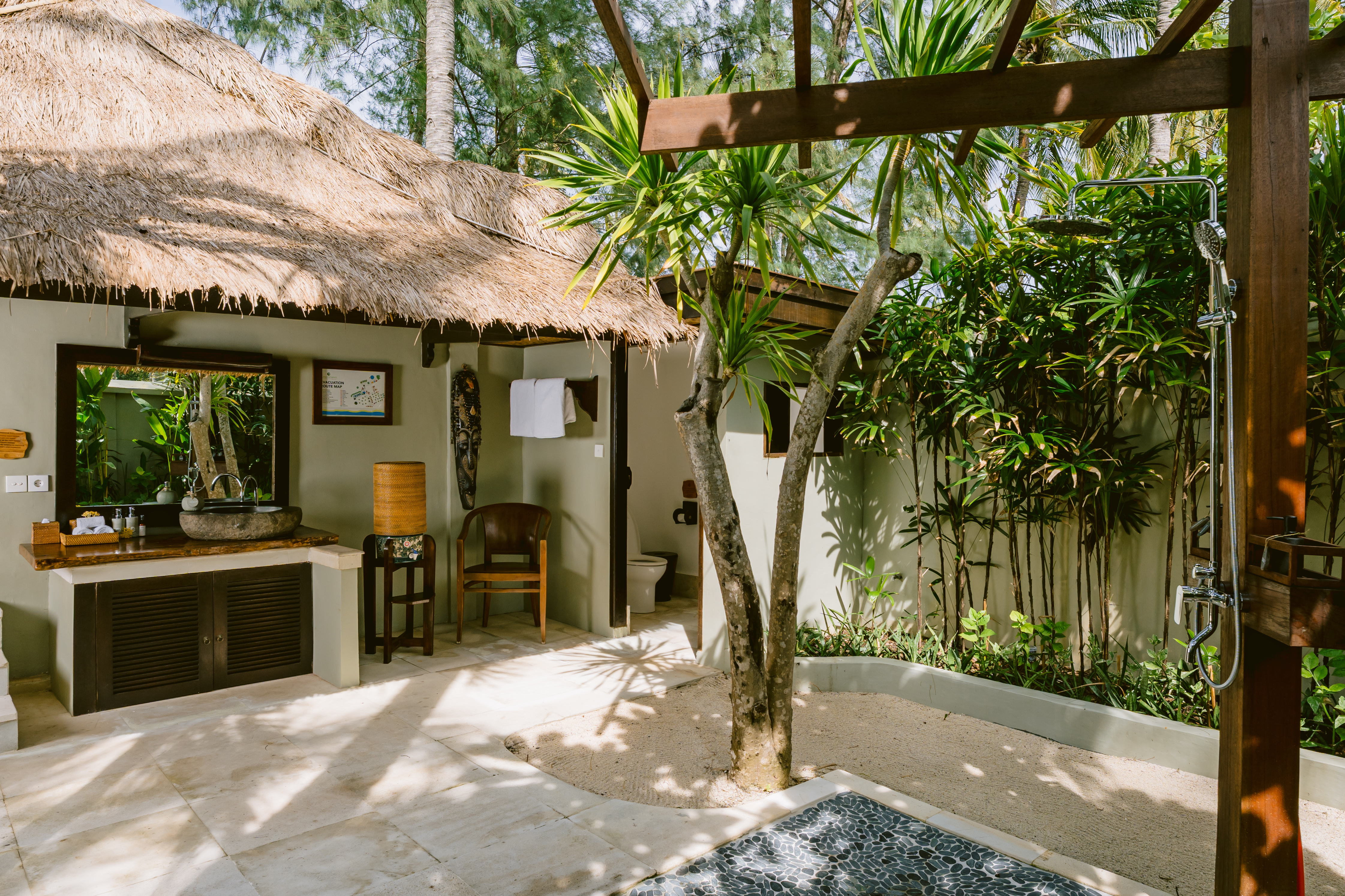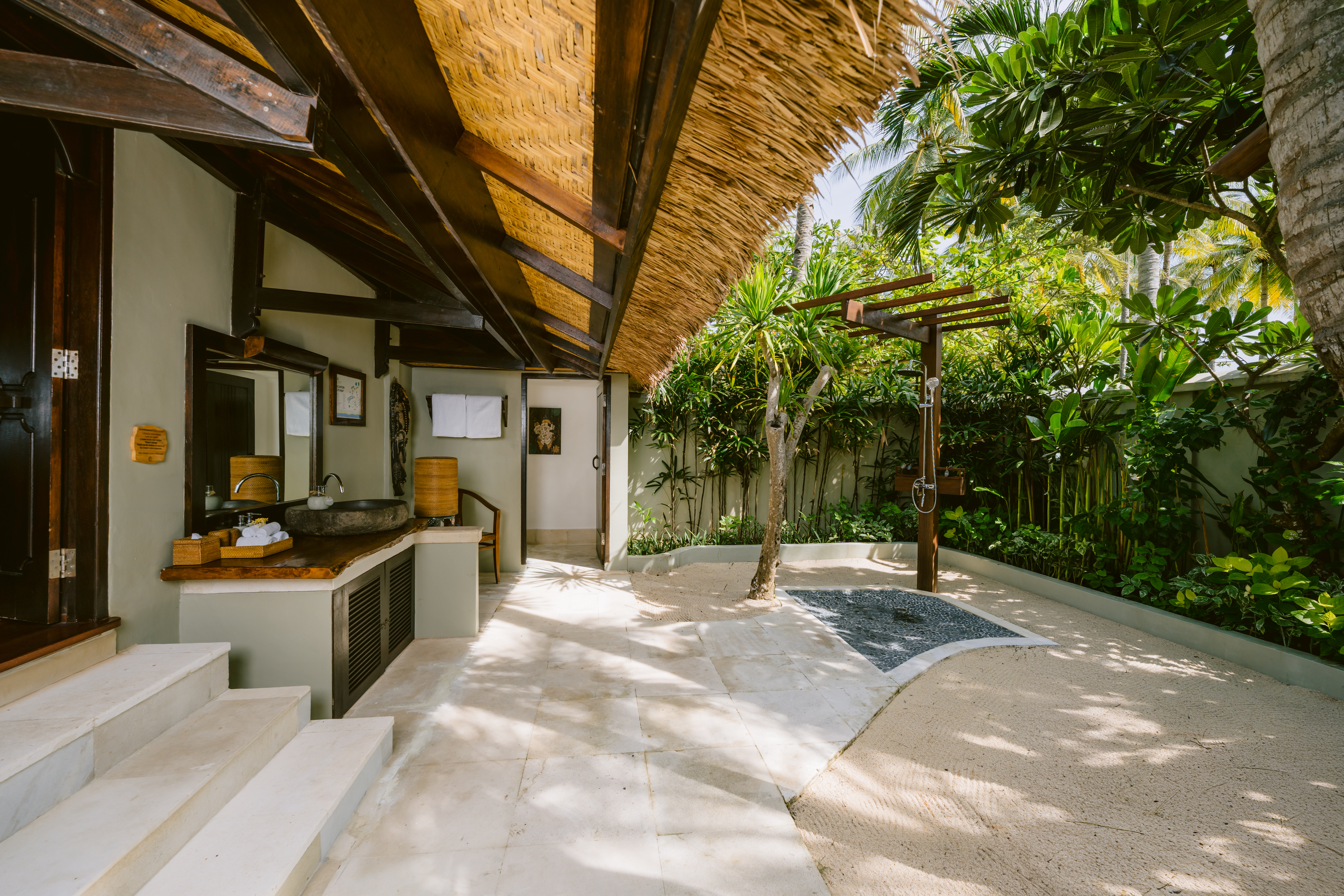 Experience the beauty of our outdoor bathrooms, set in a lush garden. The stunning outdoor showers are a unique feature of the Palm View Bungalows, offering a refreshing and luxurious bathing experience. Surrounded by greenery, these showers enhance the feeling of being one with nature, providing a serene and invigorating retreat.